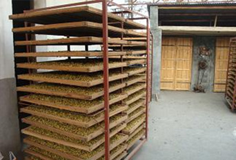 1、階段,升溫階段:將裝好菊花的托盤,平整的放入烘箱,不能重疊,避免托盤放置不好造成不必要的漏風。關閉箱門打開熱風爐風機,點燃熱風爐,開始向箱內送熱風,逐漸將箱內溫度加熱至50°,加熱30分鐘~1.5小時,看箱內有濕氣時,開始排潮,大約排潮2分鐘左右,排潮后箱內溫度會有所下降,繼續(xù)供熱。